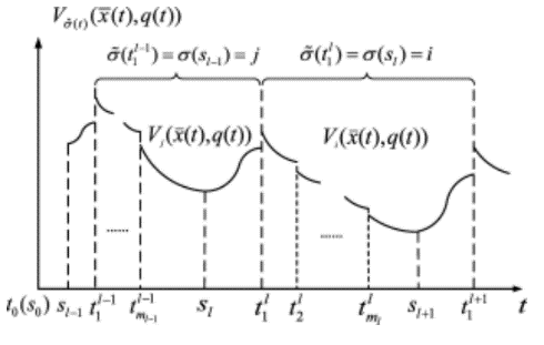 图1 多触发器依赖Lyapunov函数 图2 触发诱导的对象和滤波器异步切换信号