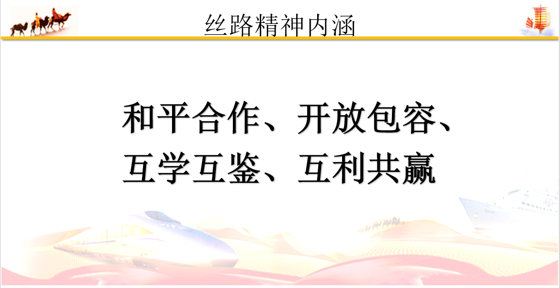 “丝路精神”即丝绸之路精神的简称。丝绸之路不仅是商业通道,更重要的是丝绸之路体现的“丝路精神”。丝绸之路作为人文社会的交往平台,多民族、多种族、多宗教、多文化在此交汇融合,在长期交往过程中各个国家之间形成了“团结互信、平等互利、包容互鉴、合作共赢,不同种族、不同信仰、不同文化背景的国家可以共享和平,共同发展”的丝路精神。