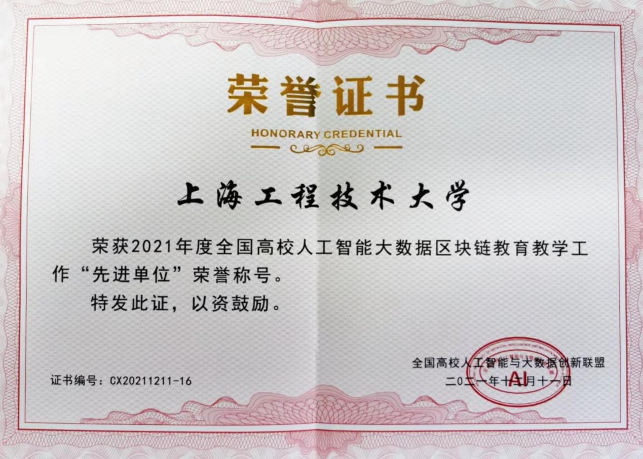 我校荣获2021年度全国高校人工智能与大数据区块链教育教学工作“先进单位”荣誉称号。