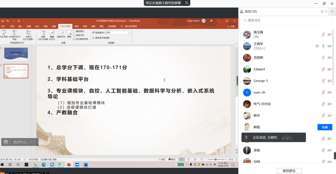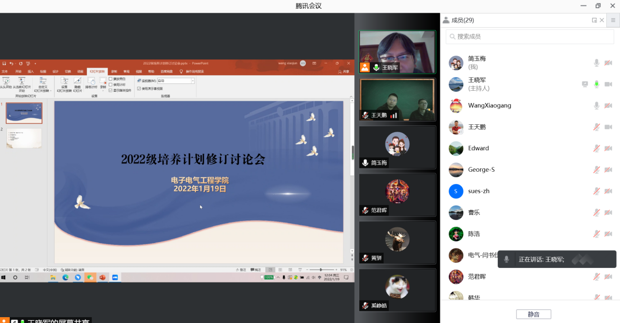 2022年1月19日,学院在腾讯会议上召开2022级培养计划修订讨论会。教务处陈浩处长、学院党委书记范君晖、上海交通大学电子信息与电气工程学院韩韬副院长、校企合作企业专家以及学院各系室负责人参加了会议,会议由学院副院长王晓军主持。