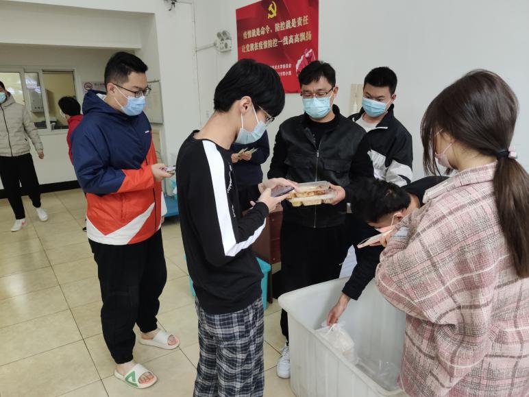 此次新冠疫情以来,学院全体师生众志成城,共克时艰。学院研究生辅导员、学生第四党支部书记张晓飞老师组织核酸、排摸数据、明细台账、实时沟通、安抚学生等每一项工作都细致入微,为我们的学生筑牢安全的防线,更是深入学校六期宿舍以校舍为家,和同学们同吃同住。协助宿舍阿姨做好学生管理,组织学生有序乘坐“巴士走廊”闭环班车,安排志愿者为每栋宿舍楼上门配餐。疫情之下,守护学生有“我”在!张老师在为学生服务时说道。