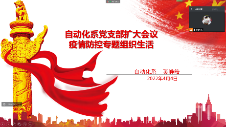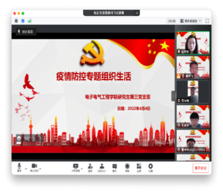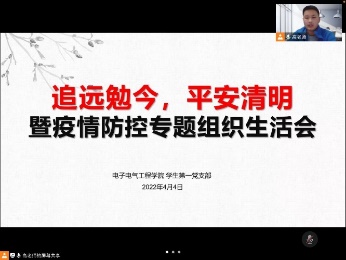我院党委书记范君晖强调:一是作为一名党员同志,要深刻认识当前疫情防控的严峻形势,更要认识到党员的责任,带头遵守疫情防控的政策,做好个人防护不添乱;二是要带头发挥党员先锋作用,冲锋在前,配合学院、社区做好防疫工作和志愿服务;三是继续重点关注师生状况,坚持导师、班导师、辅导员多通道的信息沟通,同时做好舆情工作,不信谣不传谣,相信在大家的帮助下,我们一定能共克时艰,取得胜利。