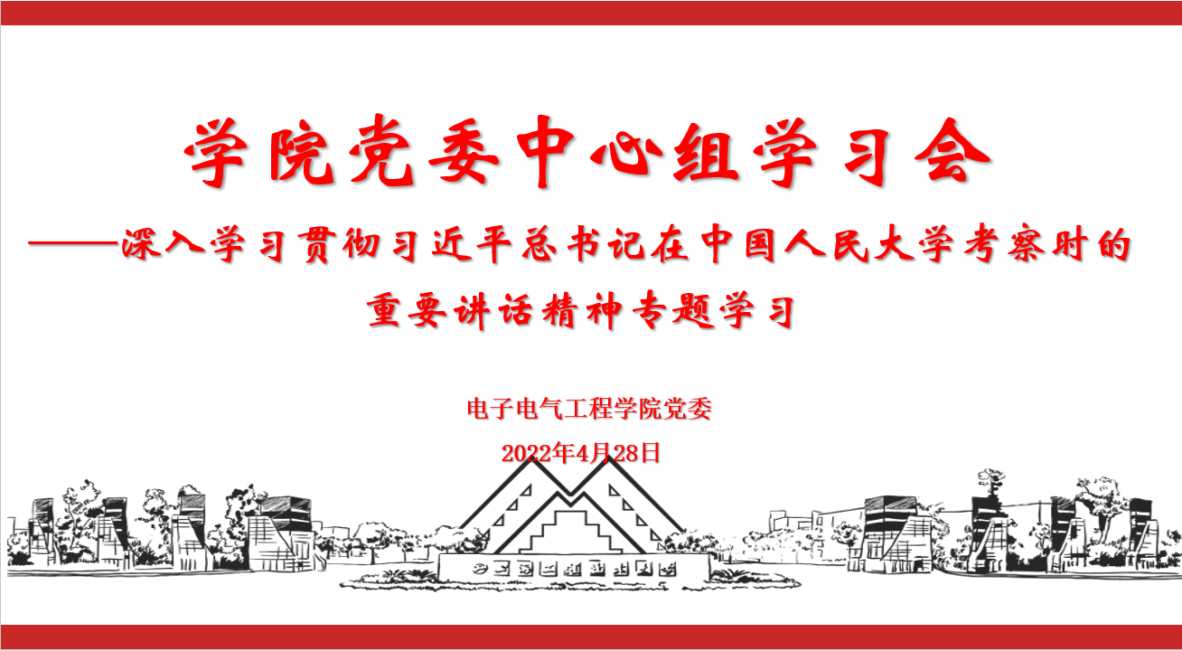 会上,大家首先集中学习了习近平总书记4月25日到中国人民大学考察调研的新闻视频。在五四青年节即将到来之际,习近平总书记代表党中央,向全国各族青年致以节日的祝贺,向全国广大教育工作者和青年工作者致以诚挚的问候。习近平总书记希望全国广大青年牢记党的教诲,立志民族复兴,不负韶华,不负时代,不负人民,在青春的赛道上奋力奔跑,争取跑出当代青年的最好成绩!习近平总书记强调,“为谁培养人、培养什么人、怎样培养人”始终是教育的根本问题。要坚持党的领导,坚持马克思主义指导地位,坚持为党和人民事业服务,落实立德树人根本任务,传承红色基因,扎根中国大地办大学,走出一条建设中国特色、世界一流大学的新路。