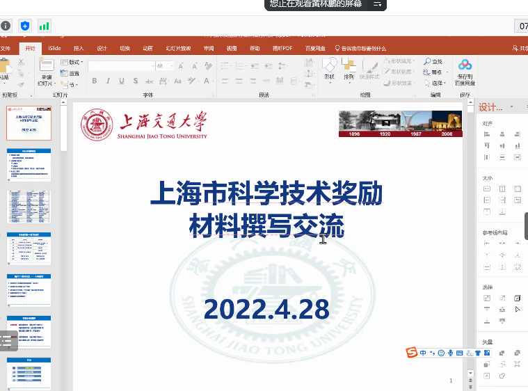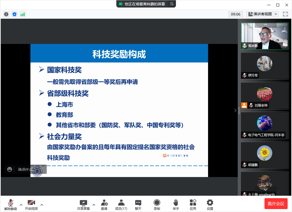 4月28日,学院线上组织召开2022年科学技术奖申报交流会,邀请到上海交通大学黄林鹏教授作报告并指导,学院2022年以及近几年有申报计划的教师参加,会议由刘瑾副院长主持。