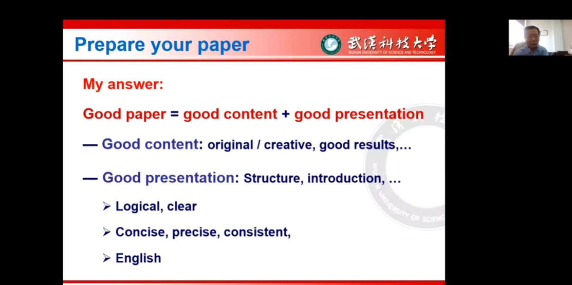 为响应学校战“疫”不停学的号召,满足疫情期间我院研究生学术研究需求,帮助同学们进一步了解论文写作标准、提升论文写作质量。5月5日下午,学院特邀武汉科技大学伍世虔教授开展了题为“How to write scientific paper”的高水平论文写作指导线上专题讲座。方志军院长、相关教师和硕士研究生200余人参加讲座。讲座由学院副院长赵晓丽主持。