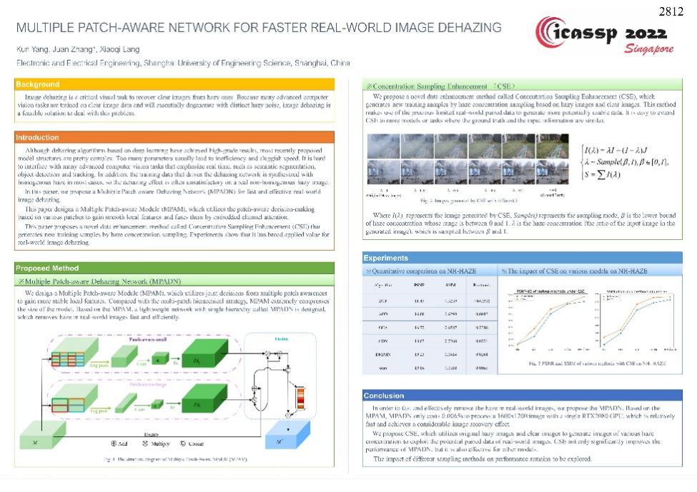 2022年5月7日至13日,ICASSP 2022(IEEE International Conference on Acoustics, Speech and Signal Processing)线上虚拟会议如期进行。我院教师张娟副教授指导研究生杨坤的研究论文(“Multiple Patch-aware Network For Faster Real-world Image Dehazing”,Kun Yang,Juan Zhang*,Xiaoqi Lang)被ICASSP 2022录用并进行了展示。
