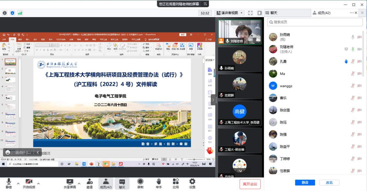 2022年6月14日,学院面向全院教师开展横向科研项目管理办法线上宣讲会,通过解读《上海工程技术大学横向科研项目及经费管理办法(试行)》相关精神与举措,进一步推进学院“产、学、研、用”相关工作的发展,鼓励学院教师面向企业需求,积极推进合作,开展各类科研项目工作。会议由学院副院长刘瑾主持。