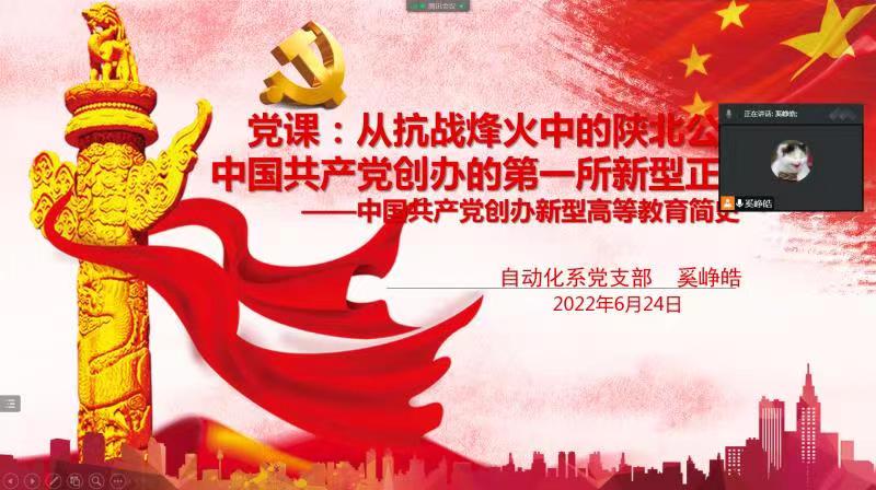 2022年6月24日,自动化系党支部通过腾讯会议线上平台开展了第二季度党课学习活动。此次党课由自动化系党支部书记奚峥皓同志带领大家学习“从抗战烽火中的陕北公学到中国共产党创办的第一所新型正规大学——中国共产党创办新型高等教育简史”。