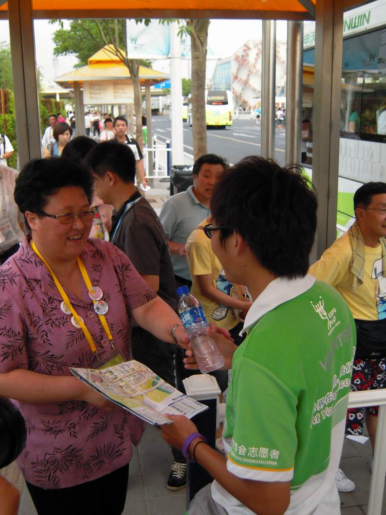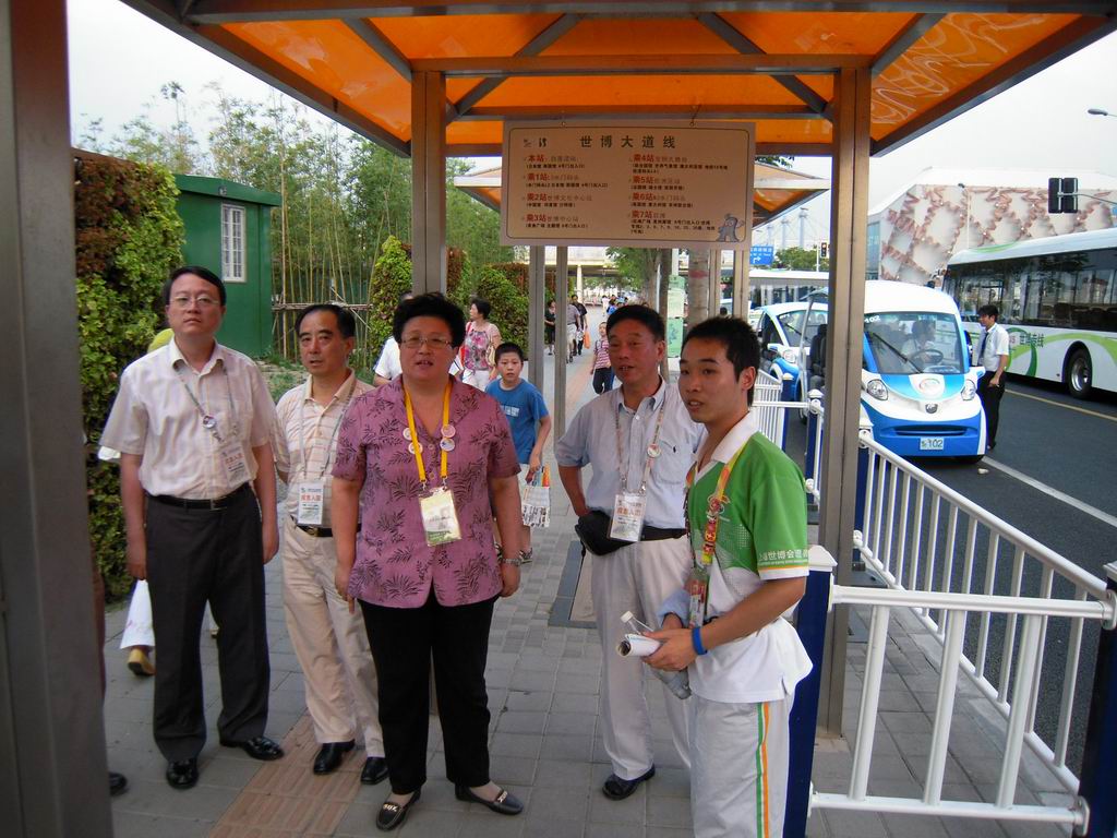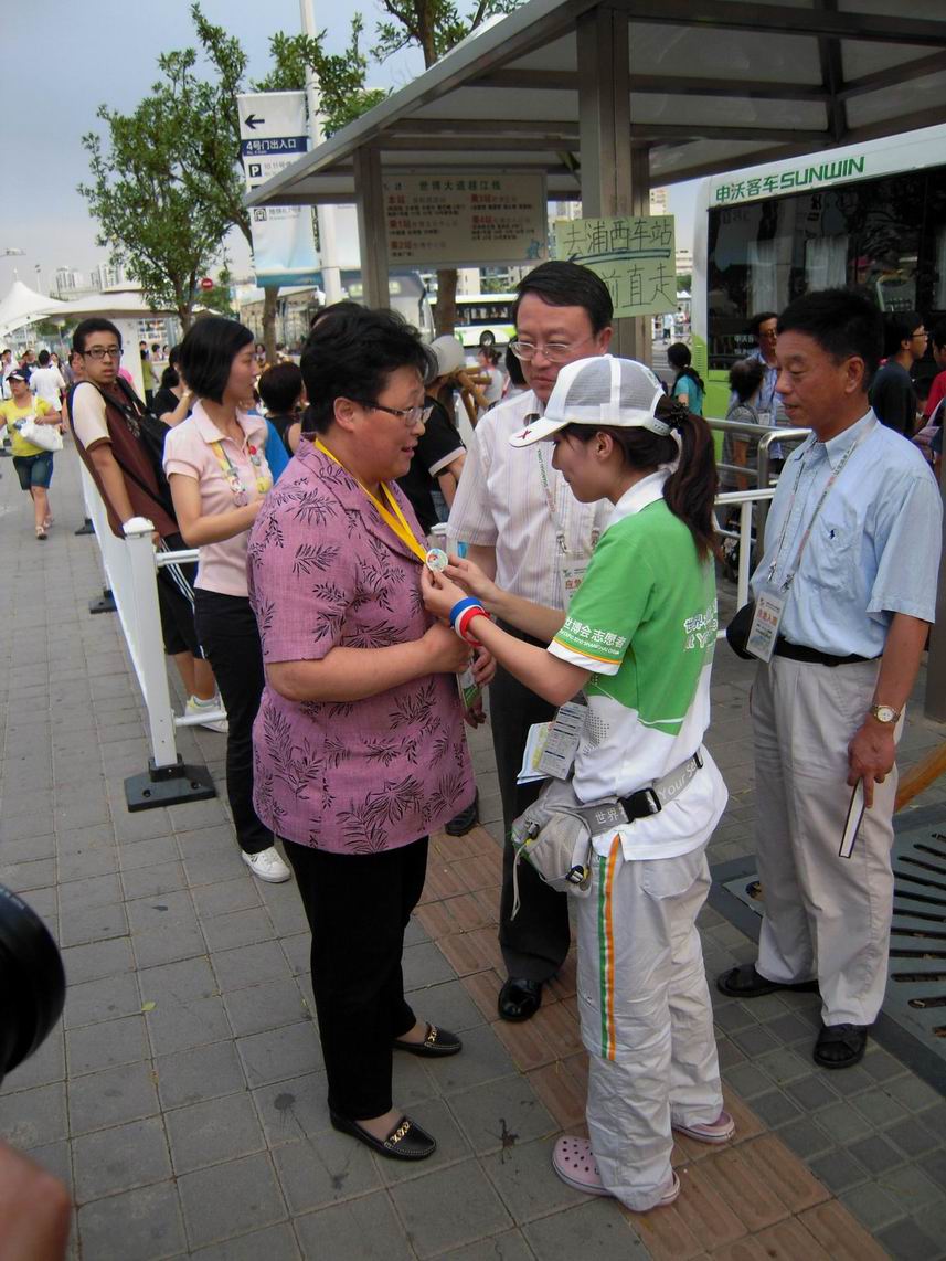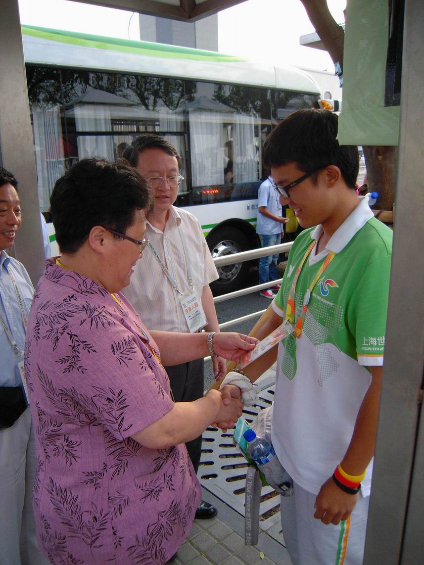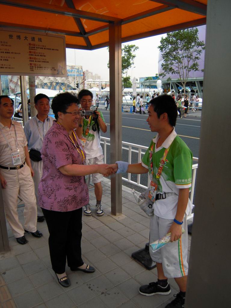 校领导先后来到世博园高科西路、博成路口和白莲泾路交通站点,为学校程程们送去了矿泉水等慰问品。汪校长亲切地对小白菜们说:“同学们,辛苦了!”,让同学们倍受感动。在这连续的高温天,汪校长十分关心大家晚间回校后的睡眠质量,希望大家要注意防暑降温,努力奉献世博的同时也要保重身体。电气程程王淼说:“感谢学校为大家开放空调房住宿,给我们带来夏日里的清凉,更让我们保证了足够的睡眠时间,第二天精神焕发地来世博园服务”。慰问至博成路口岗点时,汪校长询问正在工作的陶烨君同学累不累,他激动万分的摇摇头:“汪校长,我们不累,我们一定为校争光,圆满完成志愿服务。”走访间,汪校长对我院学生设计制作的“小白菜”职务贴纸和个性徽章产生了浓厚的兴趣,电气“小白菜”争相将自己身上佩戴的“电气程程”和七个明星志愿者徽章赠送给校领导,而汪校长则回赠我校限量版的金色校徽以资鼓励。人来人往的公交站台上,电气程程与校领导在工作岗点前合影留念。