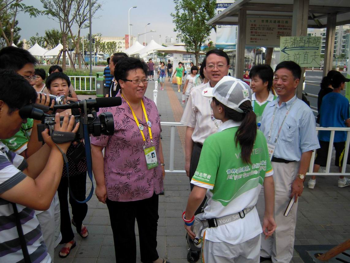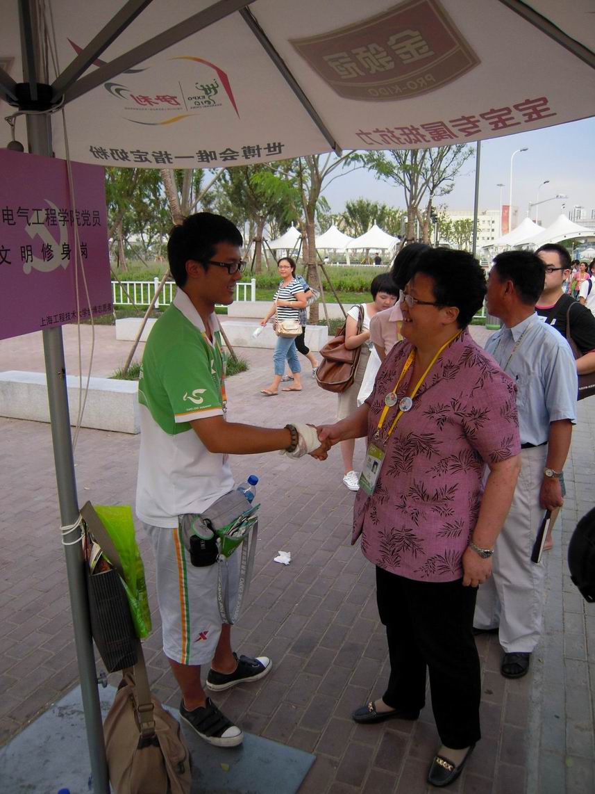 8月16日下午,校长汪泓,副校长郝建平、孙培雷、陈力华、程维明,校党委宣传部部长王一川,学生部(处)长王明复,校办主任史健勇在校团委书记茅华伟和各学院分团委书记的陪同下进入世博园区慰问我校志愿者。傍晚5:15,校长汪泓等校领导在A09、A10片区,慰问suncitygroup太阳集团程程,使小白菜们深受鼓舞。