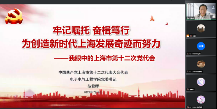 7月4日下午,我院党委书记范君晖通过线上形式,以亲历者的视角,从大会召开的基本情况、我眼中的党代会报告关键词和对几个问题的感悟等三个方面为学院学生党员、入党积极分子等讲了一场《牢记嘱托 奋楫笃行 为创造新时代上海发展奇迹而努力》的精彩党课。