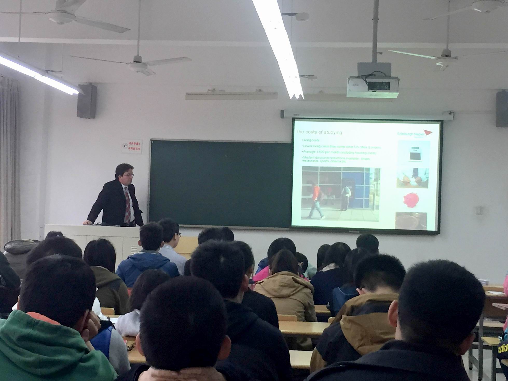 Murray MacCallum教授首先播放了一段爱丁堡龙比亚大学的宣传片,片中展示了龙比亚大学的校园风貌以及国际交流生的学习生活情况,随后他通过深情并茂的演讲,详细介绍了该校国际交换生、攻读硕士学位以及暑期游学等项目。在最后的提问环节中,同学们踊跃发言,并就交换生项目的课程设置、费用以及硕士毕业后留英工作等问题进行提问交流。气氛热烈而有序。