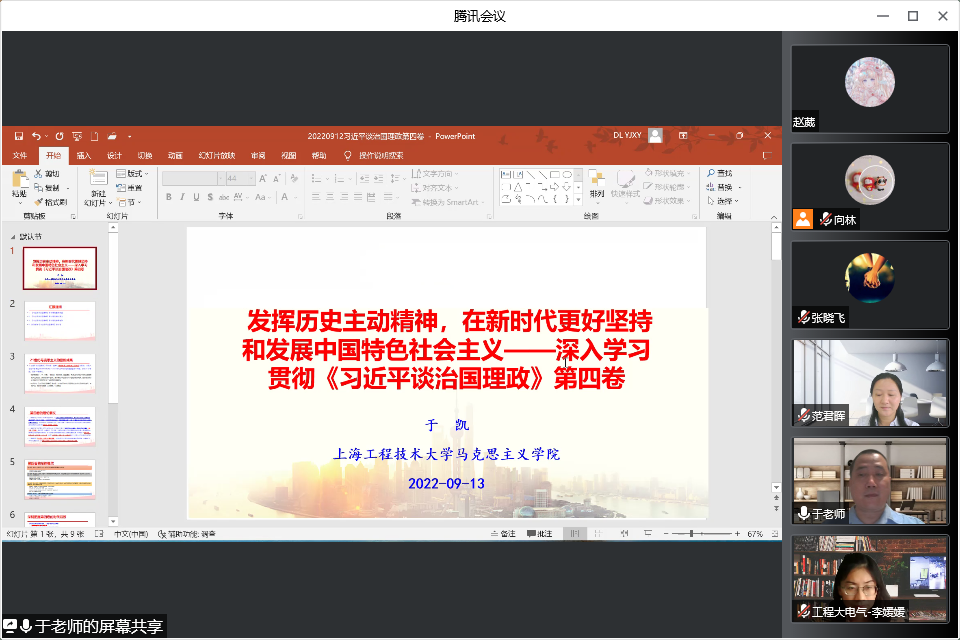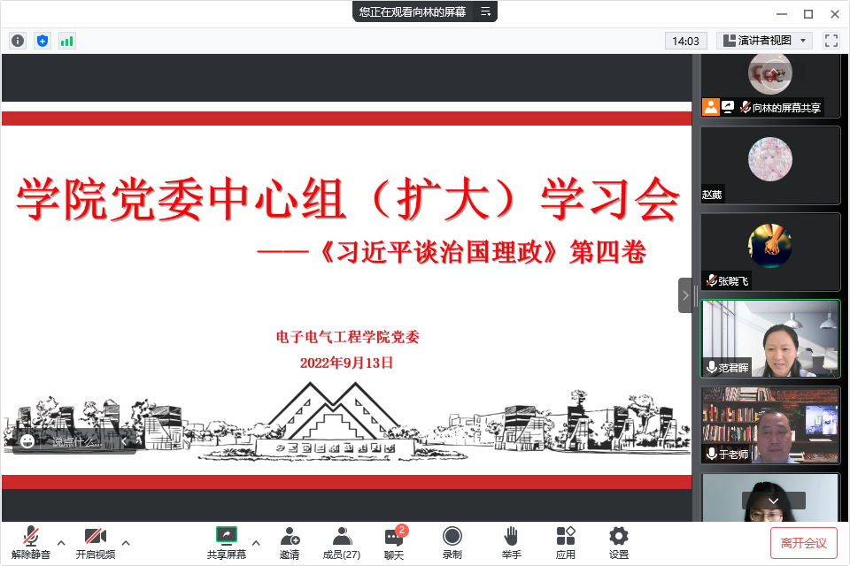 9月13日下午,我院党委中心组通过线上形式召开深入学习《习近平谈治国理政》第四卷专题扩大学习会。我院党委委员、党政领导、全体中层干部、思政教师代表等参加学习,特邀马克思主义学院副院长于凯教授出席学习会。会议由我院党委书记范君晖主持。