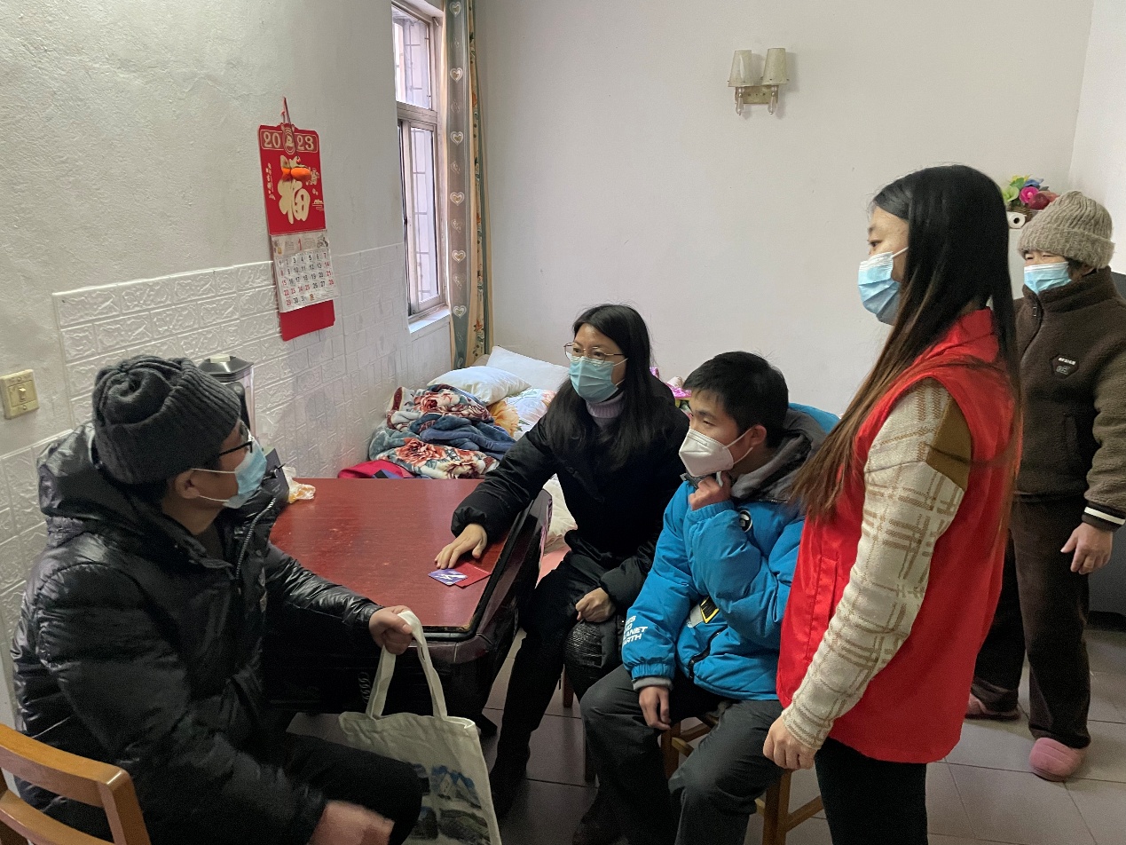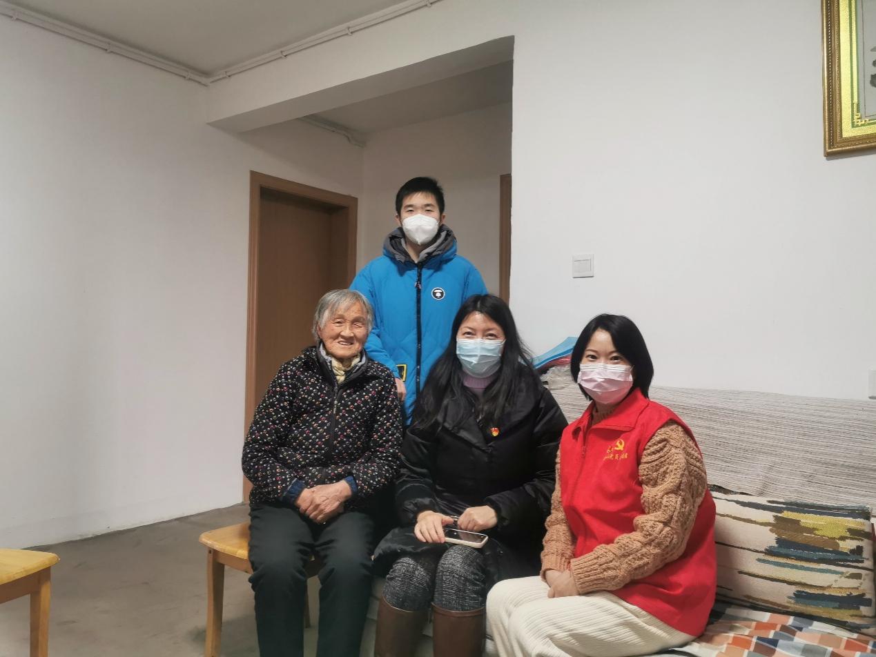 经过支部讨论,同学们一致认为上述老人的愿望看起来非常朴素,只要平日里稍微省吃俭用就可以帮助他人完成一个心愿,自己再多走几步路就可以完成到另一个阿婆家里聊聊天的心愿,大家的点滴行动就可以圆梦老人心,真是一件有意义的事情。想到就要马上行动。1月18日上午支部书记刘铁英老师和支部同学一起认领心愿,当天下午,刘老师带领胡力铭等同学前后到佘山镇天山新村为患病老人送去心愿福袋-一张300元的交通卡,了解到这位老人患肺癌,需要经常去市区医院检查身体,接受化疗,这张交通卡将会为老人带来福音。党支部师生又马不停蹄赶去佘山镇刘家山路,阿婆80岁了,几个月前老伴不幸离世,子女又不在身边,看到小胡同学,阿婆仿佛看到了自己的亲孙子,愉快地和小胡交流起来,一扫往日的阴霾情绪......