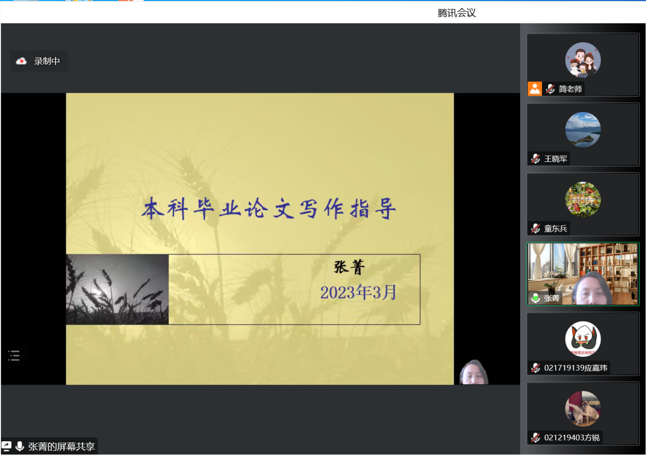 张菁老师从论文选题、格式规范以及论文的起草修订等方面进行了讲解,让同学们对毕业设计论文撰写有一个整体的认识。张老师建议大家,论文选题一定要切合实际,符合毕业要求,论文撰写要严格遵照学校提供的模板进行。同时张老师也提醒同学们务必保持论文内容的一致性和完整性,也可以把毕业设计和升学就业有机结合起来。