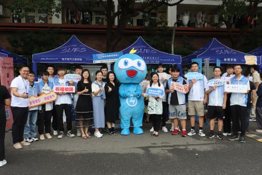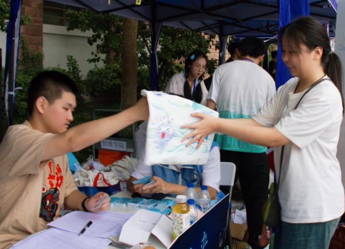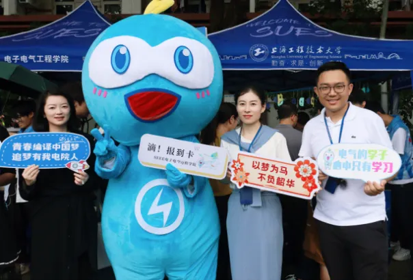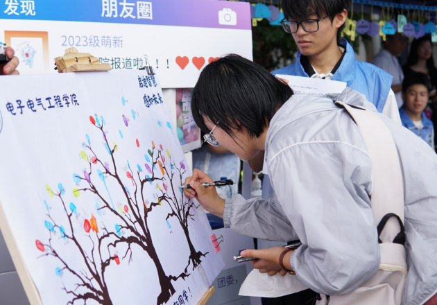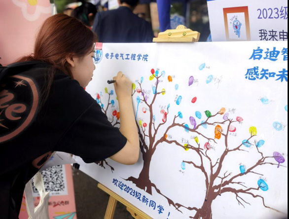为了让学生更好的了解专业特色,学院在迎新点上融合了诸多我院的元素。全场最活泼的吉祥物“小电”是新生们拍照合影的首选。让新生在带有专业名称的意向牌上写下对未来四年学习的期许。并在现场体验互动“iclass”平台,将自己的祝福弹幕投屏,“青春电气、大树成林”23级的萌新在“电院树”摁下手印,留下属于自己的开学印记。“相知陪伴帆布袋”,“温暖常在校园卡套”、“开启未来钥匙扣”和“满心祝福明信片”满满的大礼包都是对新生满满的爱。