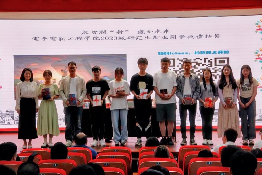典礼中期,我院党委副书记赵梦影老师,通过学院国家级人才王国中教授团队研发的IClass系统进行抽奖,将迎新季里导师推荐的多本好书作为新生礼物送给新生并合影留念,希望全体新生能够接受众多思想,拥有更开阔的视野,向世界打开自己的心胸。