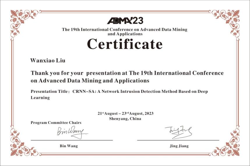 ADMA 2023设置了多个大会报告,刘皖肖同学首先在大会主会场听取了来自国际知名学者的演讲,内容涵盖了数据库系统、知识工程、查询优化、实体匹配、众包技术、大数据模型等多个领域。8月22日下午,刘皖肖同学在“隐私与安全”分会场中做了主题为“CRNN-SA: A Network Intrusion Detection Method Based on Deep Learning”的演讲报告,该报告聚焦于网络安全,提出了一种基于深度学习的网络入侵检测方法。他详细解释了这一方法的原理和应用,以及它在网络安全领域的潜在价值,同时与提问的专家学者进行了深入的探讨。
